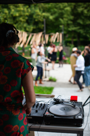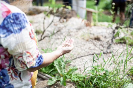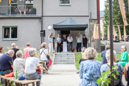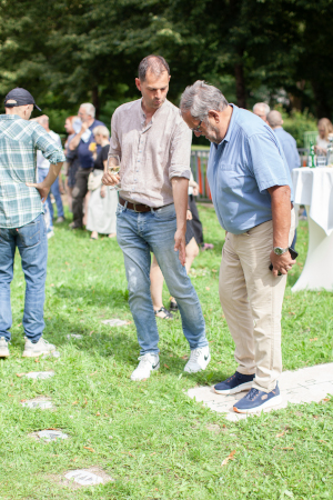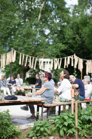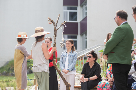 10. - 11. April 2024  Viele Besucher:innen kamen, um an der feierlichen Eröffnung des Gartens teilzunehmen.  Die Wilde Zone dient als Aufenthaltsorts für viele Insekten und weitere Lebewesen.  Bei der Eröffnung sprachen Bürgermeisterin Ines Schiller, Intendantin Elisabeth Schweeger und zahlreiche Akteur:innen über den Garten und seine Entstehung.  Die Geschicke des Gartens werden in die Hände der Lehrerinnen Sophie Jaros und Lisa Zeitler gelegt.  Gemeinsam wurde eine Samenmischung in die Wilden Zone gestreut.  Gruppenfoto mit zahlreichen Beteiligten.  Steinmetz Günter Brucker erläutert die Funktion der horizontalen Sonnenuhr.  Blick durch das Fenster der Gartenhütte in die Ausstellung.  Die Gruppe GiZiKoGla nachdem sie aufgespielt hat.  Die Musik von Andaka lud dazu ein, ausgelassen im Offenen Klassenzimmer zu tanzen.  Die beiden Künstlerinnen Daniela Brasil und Sophie Krier.  Blick auf die beiden Teile des Analemma-Forums, im Hintergrund das Offene Klassenzimmer.   Eine Metallskulptur des Analemma-Symbols überragt den Garten.  Ab sofort ist der Garten als Aufenthaltsort zum Lernen und zum Chillen da. << |