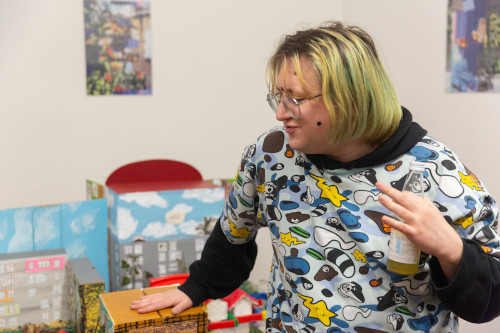 The multi-part installation “Pastime” deals with the fact that Oleksandr Halishchuk won’t be able to return to the places of his childhood and youth in the foreseeable future due to the Russian occupation. The artist, who comes from Melitopol in Ukraine, set up his former neighbourhood on three tables, in a way he liked to do as a child. Thus, he arranges micro-stories that took place around his former home and along the neighbourhood’s central Garden Street [Vulytsya Sadova]. A second layer on the wall consists of four photos from the family album from the artist’s time in Melitopol, above this, on the third level, is a projection with video material from the time since he came to Austria.