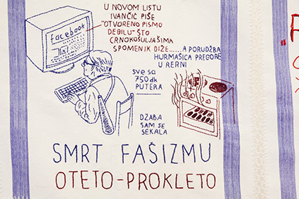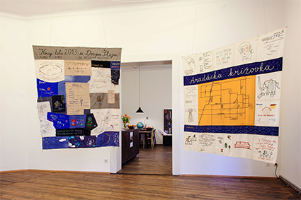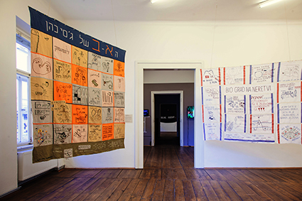| Four tapestries from the ongoing project Documentary Embroidery Office hang in the entrance room, seen here are the works “Alef-Bet of Jessy Cohen” (left) created in Jessy Cohen, a neighbourhood of Holon, Israel in 2012 and “Bio grad na Neretvi” from Mostar, Bosnia and Herzegovina, 2014. | |