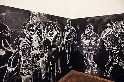 | Detail of the wall panels by bankleer, which depict scenes from the video “Minority in Majority”, 2011. | |