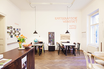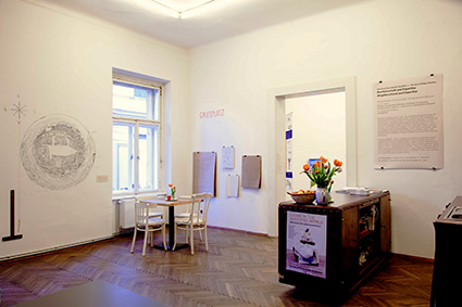 | The café room plays host to the main body of the Cartography Workshop, a six-month community-driven project which aims to reimagine the public space and meaning of three local neighbourhoods: Griesplatz, Volksgarten and Andrä-platz. | |